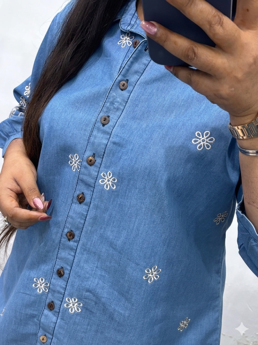 Crafted from high-quality denim with a soft, breathable feel, the set is elevated with delicate embroidery that adds a subtle yet sophisticated detail. The silhouette is designed to flatter plus-size body types while offering ease of movement and all-day comfort.